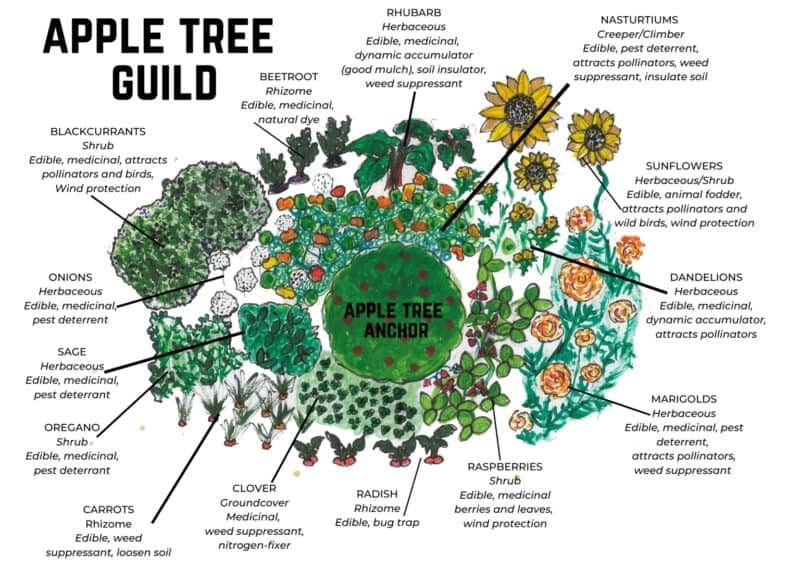 One example of a plant guild is to place a small apple tree at the centre and then surround it by comfrey (which acts as a multch and nutrient accumulator), daffodils and garlic (working to control pests and reduce the intrusion of grass), and bee balm (to attract pollinators).